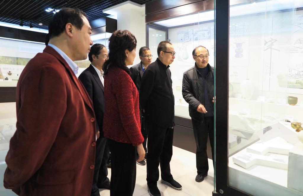 本站訊 4月1日下午,中國民協主席、中國文聯副主席、山東工藝美術學院院長潘魯生,開封市政協副主席趙潔,開封市文聯書記程崇正,開封市文聯主席甘桂芬一行,到開封大學大觀博物館、宋文化工藝品技能大師工作室及魏躍進教授工作室參觀調研。校黨委副書記儲建新、宣傳部長樊玉霞陪同參觀。