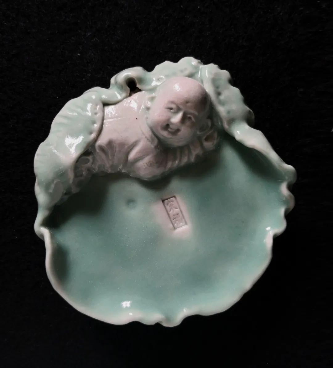 魏教授的這一批作品,名為筆舔,實則可以舔筆、香插和鎮紙三用。作品長寬約十余厘米,周邊以荷葉卷曲,形成一片“內?!?,并塑男童子、女童子、金魚于其上。童子雖有男女之別,但形貌各異,他們或笑,或嗔,或靜,或動,或憨,或巧,件件俱有不同。