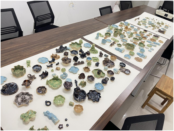 按照創新創業學院教學計劃,本次課程教學內容緊密結合開封文化旅游產業發展及高職院校學生創新創業培養需求,圍繞第九屆中國國際大學生創新創業大賽備賽工作,全面提升我校文創類參賽項目質量,課程以博物館文物陶瓷周邊產品設計為主,以陶瓷文創設計項目為驅動,組建了技能大師、教授相結合的“雙導師”教學團隊,通過示范、制作、輔導、展示交流、視頻推宣等環節,學生在掌握陶瓷制作的方法的同時,開拓學生文創產品的設計思路,培養學生審美意識與核心素養。圓滿完成了此次教學培訓任務,學生共設計制作完成了200余件優秀陶瓷文創作品,為推宣此活動,并拍攝制作完成了20多個短視頻。
