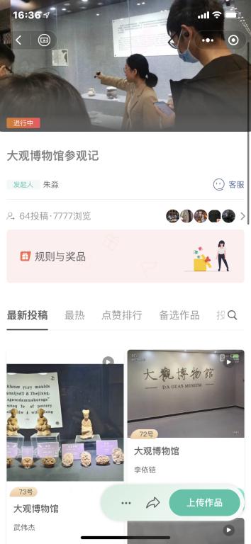 通過(guò)在館內(nèi)的實(shí)踐教學(xué),學(xué)生仔細(xì)聆聽(tīng),了解傳統(tǒng)文化的相關(guān)知識(shí),面對(duì)豐富的展品資源,學(xué)生們拍攝了大量圖片和視頻,作為課程實(shí)踐,以大觀博物館為主題制作“大觀游”視頻。在媒體網(wǎng)站進(jìn)行投票選舉。