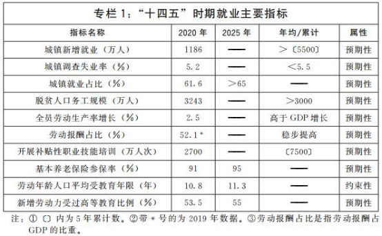 國發〔2021〕14號 各省、自治區、直轄市人民政府,國務院各部委、各直屬機構: 現將《“十四五”就業促進規劃》印發給你們,請認真貫徹執行。 國務院 2021年8月23日 (此件公開發布) “十四五”就業促進規劃 就業是最大的民生,也是經濟發展最基本的支撐。“十四五”時期,實現更加充分更高質量就業,是推動高質量發展、全面建設社會主義現代化國家的內在要求,是踐行以人民為中心發展思想、扎實推進共同富裕的重要基礎。本規劃依據《中華人民共和國國民經濟和社會發展第十四個五年規劃和2035年遠景目標綱要》編制,提出了“十四五”時期促進就業的指導思想、基本原則、主要目標、重點任務和保障措施,是推動就業高質量發展的工作指引。 一、發展環境 “十三五”期間,面對錯綜復雜的國際形勢、艱巨繁重的國內改革發展穩定任務特別是新冠肺炎疫情的嚴重沖擊,黨中央、國務院始終堅持以人民為中心,將就業擺在經濟社會發展優先位置,創新實施就業優先政策,推動就業工作取得積極進展。全國城鎮新增就業6564萬人,城鎮調查失業率均值控制在5.2%,勞動年齡人口平均受教育年限從10.2年提高到10.8年,技能勞動者總量由1.3億人增至2億人,就業形勢總體穩定,就業結構持續優化,就業質量不斷提升。 “十四五”時期是我國全面建成小康社會、實現第一個百年奮斗目標之后,乘勢而上開啟全面建設社會主義現代化國家新征程、向第二個百年奮斗目標進軍的第一個五年。當前和今后一段時期,我國發展仍然處于重要戰略機遇期,黨中央、國務院高度重視就業問題,實施就業優先戰略,為實現更加充分更高質量就業提供了根本保證;我國已轉向高質量發展階段,以國內大循環為主體、國內國際雙循環相互促進的新發展格局加快構建,經濟穩中向好、長期向好,為就業長期穩定創造了良好條件;新一輪科技革命和產業變革深入發展,新興就業創業機會日益增多;新型城鎮化、鄉村振興孕育巨大發展潛力,新的就業增長點不斷涌現;勞動力市場協同性增強,勞動力整體受教育程度上升,社會性流動更加順暢,為促進就業夯實了人力資源支撐。 但也要看到,“十四五”時期就業領域也出現了許多新變化新趨勢。人口結構與經濟結構深度調整,勞動力供求兩側均出現較大變化,產業轉型升級、技術進步對勞動者技能素質提出了更高要求,人才培養培訓不適應市場需求的現象進一步加劇,“就業難”與“招工難”并存,結構性就業矛盾更加突出,將成為就業領域主要矛盾。城鎮就業壓力依然較大,促進高校畢業生等重點群體就業任務艱巨,在工業化、城鎮化進程中,還有大量農村富余勞動力需要轉移就業,規模性失業風險不容忽視。同時,就業歧視仍然存在,靈活就業人員和新就業形態勞動者權益保障亟待加強;人工智能等智能化技術加速應用,就業替代效應持續顯現;國際環境日趨復雜,不穩定性不確定性明顯增加,對就業的潛在沖擊需警惕防范。總之,就業形勢仍較嚴峻。必須深刻認識就業領域主要矛盾的變化,深入分析面臨的挑戰和風險,堅持問題導向,采取務實舉措,抓住機遇,調動各種積極因素,不斷開創就業工作新局面,努力實現更加充分更高質量就業。 二、總體要求 (一)指導思想。 以習近平新時代中國特色社會主義思想為指導,深入貫徹黨的十九大和十九屆二中、三中、四中、五中全會精神,統籌推進“五位一體”總體布局,協調推進“四個全面”戰略布局,堅持穩中求進工作總基調,立足新發展階段,完整、準確、全面貫徹新發展理念,構建新發展格局,統籌發展和安全,以實現更加充分更高質量就業為主要目標,深入實施就業優先戰略,健全有利于更加充分更高質量就業的促進機制,完善政策體系、強化培訓服務、注重權益保障,千方百計擴大就業容量,努力提升就業質量,著力緩解結構性就業矛盾,切實防范和有效化解規模性失業風險,不斷增進民生福祉,推動全體人民共同富裕邁出堅實步伐。 (二)基本原則。 ——堅持就業導向、政策協同。繼續把就業擺在經濟社會發展和宏觀政策優先位置,作為保障和改善民生頭等大事,把穩定和擴大就業作為宏觀調控的優先目標和經濟運行合理區間的下限,根據就業形勢變化,及時調整宏觀政策取向、聚力支持就業。 ——堅持擴容提質、優化結構。兼顧容量、質量與結構,抓住主要矛盾,在多措并舉創造更多高質量就業崗位的同時,更加重視日益凸顯的結構性就業矛盾,聚焦勞動者技能素質提升,突出抓好技術技能人才培養培訓,推動形成勞動力市場更高水平的供需動態平衡。 ——堅持市場主導、政府調控。推動有效市場和有為政府更好結合,既要堅持市場化社會化就業方向,加快破除制約就業的體制機制障礙,充分發揮市場配置勞動力資源的決定性作用,又要強化政府責任,優化整合各類資源,為促進就業提供強有力政策支持和基礎性服務保障。 ——堅持聚焦重點、守住底線。緊盯就業領域關鍵環節和突出問題,瞄準重點地區、重點行業和重點群體,制定更加精準有效的舉措,因地因企因人強化分類幫扶援助,切實兜牢民生底線。 (三)主要目標。 到2025年,要實現以下目標: ——就業形勢總體平穩。城鎮新增就業5500萬人以上,努力實現更大規模,城鎮調查失業率控制在5.5%以內,重點群體就業保持穩定。城鄉、區域就業機會差距逐步縮小,勞動力