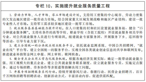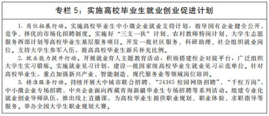 五、完善重點群體就業支持體系,增強就業保障能力 聚焦高校畢業生等重點群體,堅持市場化社會化就業與政府幫扶相結合,促進多渠道就業創業。 (十)持續做好高校畢業生就業工作。 拓寬高校畢業生市場化社會化就業渠道。結合國家重大戰略布局、現代產業體系建設、中小企業創新發展,創造更多有利于發揮高校畢業生專長和智力優勢的知識技術型就業崗位。健全激勵保障機制,暢通成長發展通道,引導高校畢業生到中西部、東北、艱苦邊遠地區和城鄉基層就業。圍繞鄉村振興戰略,服務鄉村建設行動和基層治理,擴大基層教育、醫療衛生、社區服務、農業技術等領域就業空間。為有意愿、有能力的高校畢業生創新創業提供資金、場地和技術等多層次支持。 強化高校畢業生就業服務。健全校內校外資源協同共享的高校畢業生就業服務體系,完善多元化服務機制,將留學回國畢業生及時納入公共就業人才服務范圍。加強職業生涯教育和就業創業指導,加大就業實習見習實踐組織力度,開展大規模、高質量高校畢業生職業技能培訓,提高高校畢業生就業能力。實施常態化高校畢業生就業信息服務,精準組織線上線下就業服務活動,舉辦行業性、區域性、專業性專場招聘,加強戶籍地、求職地、學籍地政策服務協同,提高供需匹配效率。對離校未就業高校畢業生開展實名制幫扶,健全困難高校畢業生就業援助機制。強化擇業就業觀念引導,推動高校畢業生積極理性就業。開展“最美基層高校畢業生”學習宣傳活動。