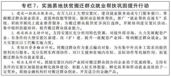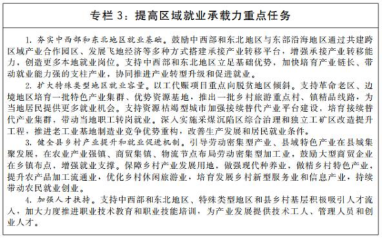 (六)提高區域就業承載力。 推動區域就業協調發展。支持東部地區發揮創新要素集聚優勢,率先實現產業升級,開拓高質量就業新領域,培育高質量就業增長極。加快完善中西部和東北地區基礎設施,提升產業集聚區公共服務效能,引導產業向中西部和東北地區有序梯度轉移,推動就業機會向中西部和東北地區擴散。支持中西部和東北地區根據國家戰略導向和發展重點,對接先進生產要素和創新資源,發展特色優勢產業,改造提升傳統產業,積極布局新興產業,厚植就業創業沃土。 實施特殊類型地區就業促進行動。健全鞏固拓展脫貧攻堅成果長效機制,統籌各類政策資源,強化后續扶持,以脫貧地區為重點,支持欠發達地區因地制宜發展吸納就業效果好的富民產業。支持革命老區、邊境地區等發展本地特色產業,推進資源型地區加快培育發展接續替代產業,完善就地就近就業配套設施,做好邊民、少數民族勞動者和失地農民、下崗礦工、停產企業員工等困難群體就業幫扶。對高失業率地區開展專項就業援助,針對性開發和推薦就業崗位,促進失業人員再就業。 壯大縣鄉村促就業內生動力。深入推進新型城鎮化和鄉村振興戰略有效銜接,推動縣鄉村聯動發展,促進產鎮融合、產村一體,打造“一縣一業”、“一鄉一特”、“一村一品”經濟圈,做好產業和就業幫扶。推進以縣城為重要載體的城鎮化建設,補短板強弱項,增強綜合服務能力,促進綠色低碳發展,吸引各類生產要素向縣城流動聚集,做大做強縣域經濟,擴大縣城就業需求。支持鄉鎮提升服務功能,增加生產生活要素供給,為發展產業、帶動就業創造良好條件,把鄉鎮建設成拉動農村勞動力就業的區域中心。完善農村一二三產業融合發展體系,豐富鄉村經濟業態,促進鄉村產業多模式融合、多類型示范,打造鄉村產業鏈供應鏈,加快鄉村產業振興步伐,培育鄉村就業增長極。