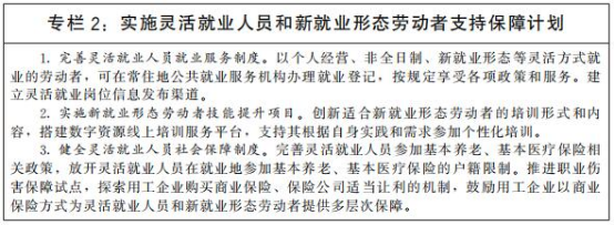 三、堅持經濟發展就業導向,不斷擴大就業容量 落實就業優先戰略,強化就業優先政策,推動形成高質量發展與就業擴容提質互促共進的良性循環。 (四)全面增強就業吸納能力。 強化就業優先導向的宏觀調控。將就業優先政策置于宏觀政策層面并持續強化,完善調控手段,充實政策工具箱,強化財政、貨幣、投資、消費、產業、區域等政策支持就業的導向,實現與就業政策協同聯動。深入實施擴大內需戰略,持續促進消費、增加有效投資拉動就業,通過保市場主體保就業。健全就業影響評估機制,制定實施宏觀政策時要充分考慮對就業的影響,提升重大政策規劃、重大工程項目、重大生產力布局對就業的促進作用。健全就業目標責任考核機制,建立更加充分更高質量就業考核評價體系,探索開展高質量就業地區試點工作。 促進制造業高質量就業。實施制造業降本減負行動,引導金融機構擴大制造業中長期融資,提升制造業盈利能力,提高從業人員收入水平,增強制造業就業吸引力,緩解制造業“招工難”問題。推進制造業高質量發展和職業技能培訓深度融合,促進制造業產業鏈、創新鏈與培訓鏈有效銜接。支持吸納就業能力強的勞動密集型行業發展。注重發展技能密集型產業,推動傳統制造業轉型升級賦能、延伸產業鏈條,開發更多制造業領域技能型就業崗位。立足我國產業規模優勢、配套優勢和部分領域先發優勢,發展服務型制造新模式,做大做強新興產業鏈,推動先進制造業集群發展,打造更多制造業就業增長點。 擴大服務業就業。聚焦產業轉型升級和消費升級需要,構建優質高效、結構優化、競爭力強的服務產業新體系,為勞動者就業提供更大空間和更多選擇。進一步放寬服務業市場準入,深入推進服務業擴大開放,促進服務業數字化轉型、線上線下雙向發展,推動現代服務業同先進制造業、現代農業深度融合,支持生產性服務業和服務外包創新發展,加快生活服務業高品質和多樣化升級,鼓勵商貿流通和消費服務業態與模式創新,引導夜間經濟、便民生活圈等健康發展,穩定開發社區超市、便利店、社區服務和社會工作服務崗位,充分釋放服務業就業容量大的優勢。 拓展農業就業空間。深化農業供給側結構性改革,加強現代農業產業園和農業現代化示范區建設,打造農業全產業鏈,提升農業價值鏈,吸納帶動更多就業。實施農民合作社規范提升行動、家庭農場培育計劃和高素質農民培育計劃,推動小農戶與現代農業發展有機銜接,扶持一批農業產業化龍頭企業牽頭、家庭農場和農民合作社跟進、廣大小農戶參與的農業產業化聯合體,實現抱團發展,促進農民就業增收。 支持中小微企業和個體工商戶持續穩定發展增加就業。完善促進中小微企業和個體工商戶發展和用工的制度環境和政策體系,構建常態化援企穩崗幫扶機制,持續減輕中小微企業和個體工商戶負擔,激發中小微企業和個體工商戶活力,增強就業崗位創造能力。優化中小微企業發展生態,取消各類不合理限制和壁壘。支持勞動者創辦投資小、見效快、易轉型、風險小的小規模經濟實體。加大對中小微企業和個體工商戶融資支持力度,加強普惠金融服務。 (五)培育接續有力的就業新動能。 促進數字經濟領域就業創業。加快發展數字經濟,推動數字經濟和實體經濟深度融合,催生更多新產業新業態新商業模式,培育多元化多層次就業需求。健全數字規則,強化數據有序共享和信息安全保護,加快推動數字產業化,打造具有國際競爭力、就業容量大的數字產業集群。深入實施“上云用數賦智”行動,推進傳統線下業態數字化轉型賦能,創造更多數字經濟領域就業機會。促進平臺經濟等新產業新業態新商業模式規范健康發展,帶動更多勞動者依托平臺就業創業。 支持多渠道靈活就業和新就業形態發展。破除各種不合理限制,建立促進多渠道靈活就業機制,支持和規范發展新就業形態。鼓勵傳統行業跨界融合、業態創新,增加靈活就業和新就業形態就業機會。加快落實《關于維護新就業形態勞動者勞動保障權益的指導意見》,建立完善適應靈活就業和新就業形態的勞動權益保障制度,引導支持靈活就業人員和新就業形態勞動者參加社會保險,提高靈活就業人員和新就業形態勞動者社會保障水平。規范平臺企業用工,明確平臺企業勞動保護責任。健全職業分類動態調整機制,持續開發新職業,發布新職業標準。