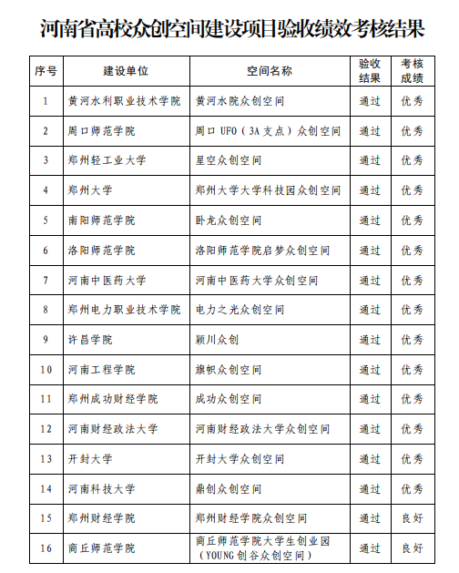 據悉,河南省教育廳共對33個高校眾創空間進行了驗收考核。其中,確定了14個優秀,12個良好,3個合格,4個不合格。對考核為“優秀”的建設項目,河南省教育廳將通過高校重點科研項目資助的方式給予獎補。