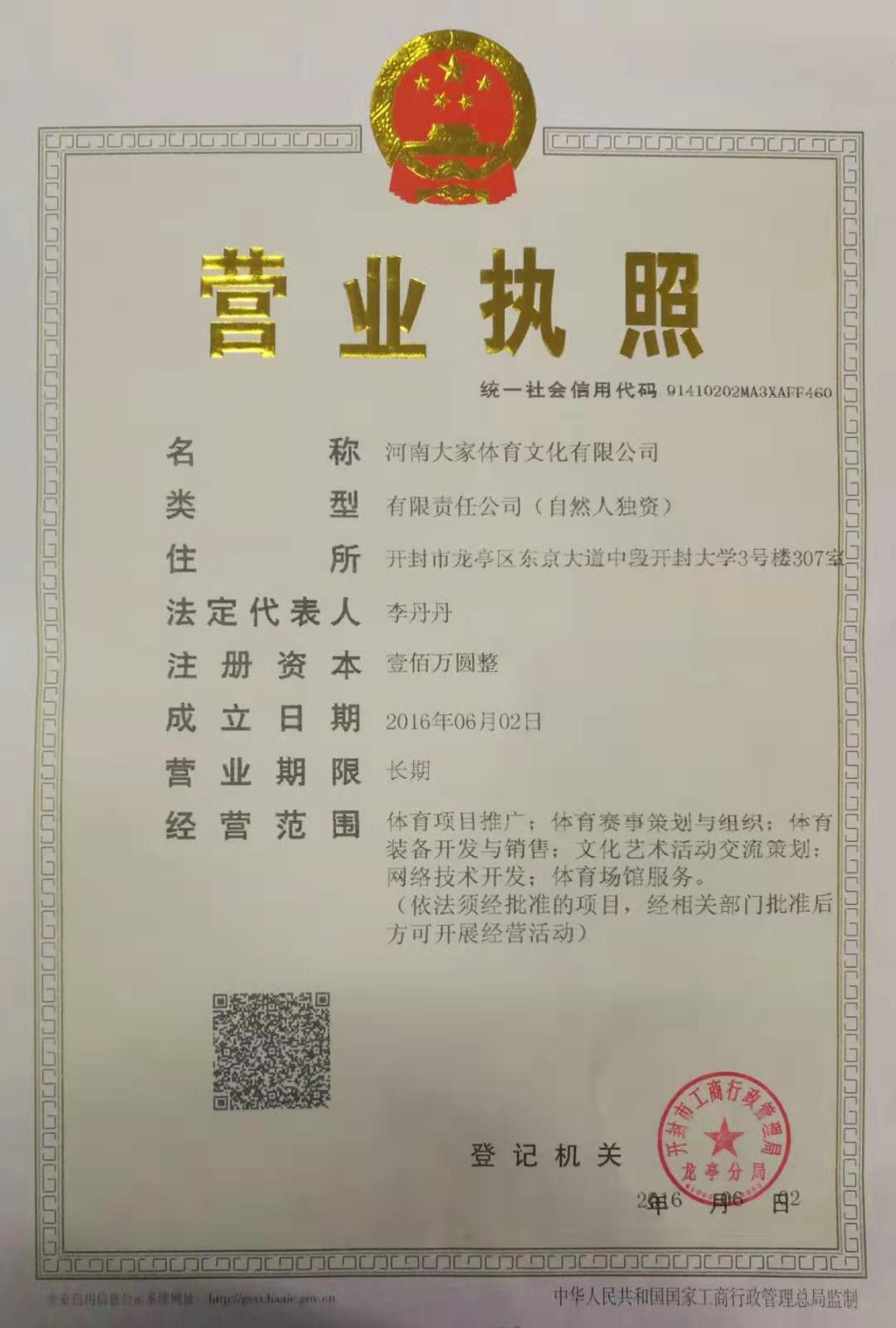 河南大家體育文化有限公司于2016年6月注冊(cè)成立,主要從事體育項(xiàng)目推廣、體育賽事策劃與組織、體育裝備開(kāi)發(fā)與銷售、文化藝術(shù)活動(dòng)交流策劃、網(wǎng)絡(luò)技術(shù)開(kāi)發(fā)、體育場(chǎng)館服務(wù)等。
