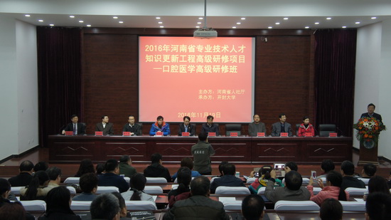 本站訊 11月18日至21日,由河南省人社廳主辦,我校醫學部承辦的“2016年河南省專業技術人才知識更新工程高級研修項目---口腔醫學高級研修班”在我校行政樓一樓報告廳開班。河南省繼續教育委員會秘書長楊利民、河南省人社廳專計處專業技術人才管理辦公室主任周松欽和我校副校長李新春出席了開班儀式,河南省口腔醫學會、開封市口腔醫學會部分代表,來自河南省10多個地市的近100余名具有高級職稱的口腔界專家、學者以及我校醫學部口腔專業教師加了開班儀式。