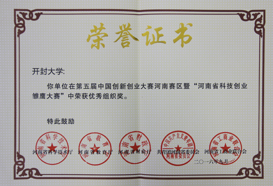 本站訊 近日,從河南省科學(xué)技術(shù)廳、河南省教育廳、河南省財(cái)政廳、中國(guó)共產(chǎn)主義青年團(tuán)河南委員會(huì)和河南省工商業(yè)聯(lián)合會(huì)下發(fā)的《關(guān)于公布第五屆中國(guó)創(chuàng)新創(chuàng)業(yè)大賽河南賽區(qū)暨“河南省科技創(chuàng)新雛鷹大賽”優(yōu)秀企業(yè)獎(jiǎng)、優(yōu)秀團(tuán)隊(duì)獎(jiǎng)和優(yōu)秀組織獎(jiǎng)名單的通知》(豫科[2016]170號(hào))中獲悉,我校在第五屆中國(guó)創(chuàng)新創(chuàng)業(yè)大賽河南賽區(qū)暨“河南省科技創(chuàng)新雛鷹大賽”中獲得“優(yōu)秀組織獎(jiǎng)”榮譽(yù)稱號(hào)。