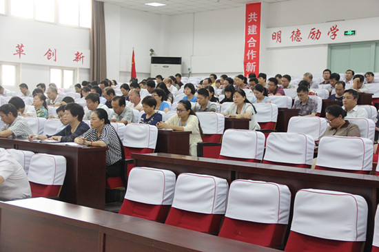 本站訊 9月7日下午,我校新學期工作會在行政樓一樓會議廳召開。校領導張新梅、宋志敏、儲建新、萬是明、趙輝、范金梅、何世玲、成芳、曾小平和李治出席會議,我校副科級以上干部、正教授參加了會議。會議由校黨委書記張新梅主持。