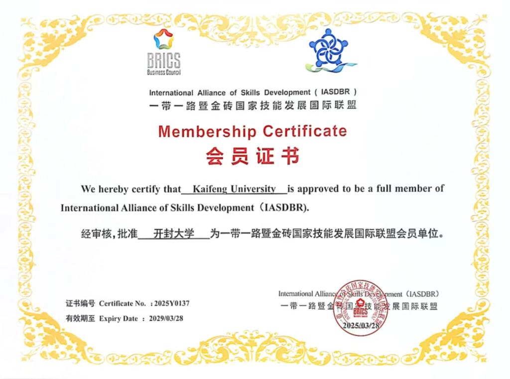 經聯盟理事會審議,開封大學正式獲批一帶一路暨金磚國家技能發展國際聯盟會員單位和社會服務專業委員會副主任委員單位。這標志著學校在深化金磚國家職業教育合作、推動數字技術技能標準互認方面取得的突破性進展,為構建“雙循環”新發展格局貢獻職教力量。