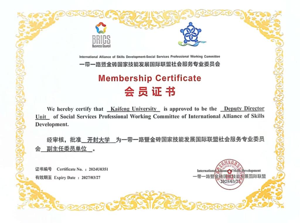 開封大學獲批一帶一路暨金磚國家技能發展國際聯盟會員單位與社會服務專業委員會副主任委員單位