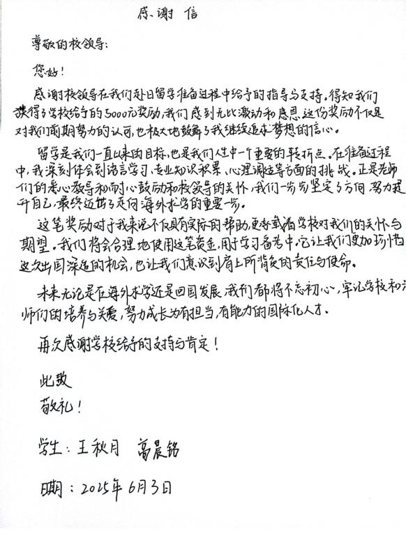 本站訊 近日,我校國際教育學院(外國語學院)應用日語專業交換生王秋月、高晨銘從日本觀光大學傳來佳訊,兩位同學以優異表現榮獲開封大學交換生項目學業優秀獎學金,并聯合致信學校,深情表達對學校悉心培養的感激之情,字里行間洋溢著對師長教誨的感恩與對專業成長的熱忱。