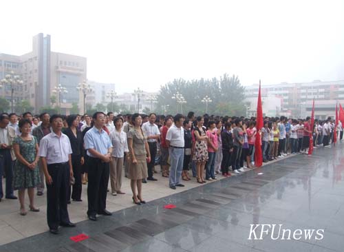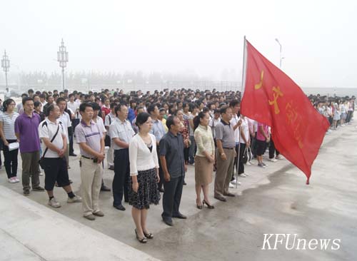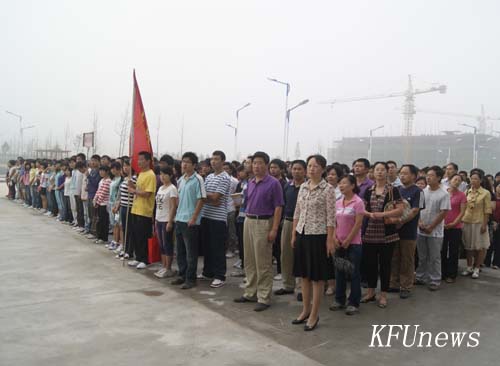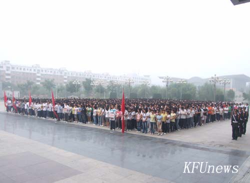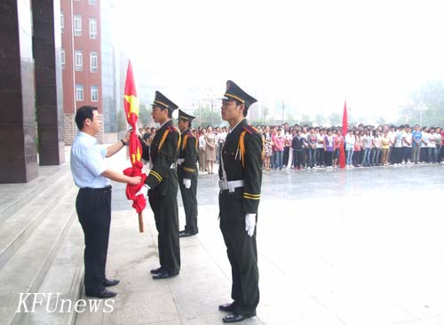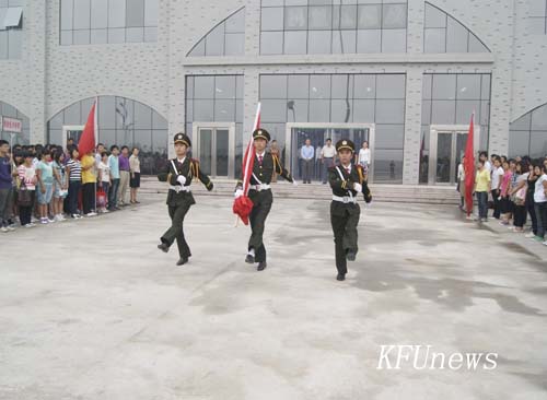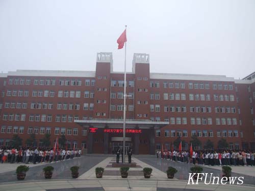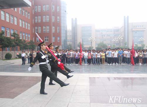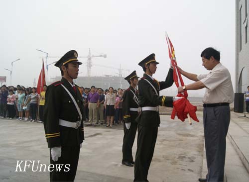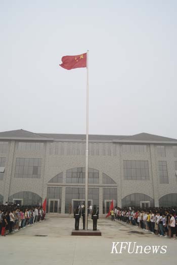 7時10分,新校區和老校區三名身著統一制服的國旗手分別從黨委書記莫華林和校長拜五四手中接過五星紅旗,邁著堅定的步伐走向升旗臺。伴隨著莊嚴的國歌聲,鮮艷的五星紅旗在朝陽下冉冉升起,全體人員行注目禮。禮畢,在新校區的黨委副書記、副校長儲建新、在老校區的副校長萬是明代表學校黨委、行政講話。他們希望在新學期中,全體師生員工繼續弘揚“艱苦奮斗、質量強校、科研興校、特色立校”的開大精神,進一步解放思想、優化管理、總結經驗、改革創新、相互協作,為確保我校高水平地進入“河南省示范性高職院校”行列而努力奮斗。希望同學們珍惜寶貴的大學時光,掌握專業知識的同時博采眾長,“內修素養、外塑形象”,學會學習,學會生活,努力成為既精通專業知識,又全面發展的優秀大學生。