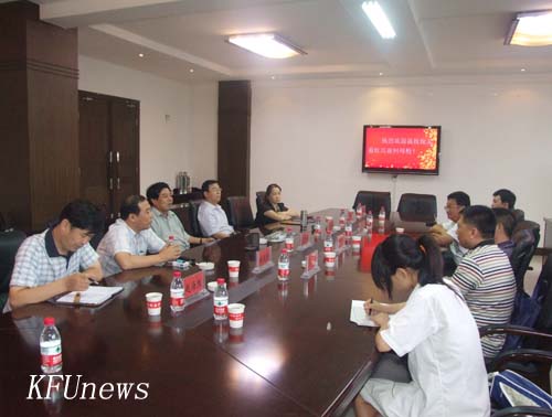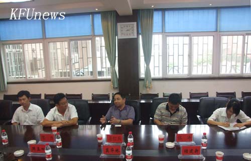 本站訊 8月13日下午,我校校友、開封歐帕自動化有限公司總經理范紅兵返回母校,把打算向母校捐贈一部價值近40萬元校車的心愿告訴母校,帶著感恩母校培育之情,向開大30年校慶獻禮。校領導莫華林、拜五四、儲建新,以及相關部門負責人在行政樓二樓會議室接待了范紅兵校友一行,并就捐贈程序、形式和手續等細節問題進行了商談。