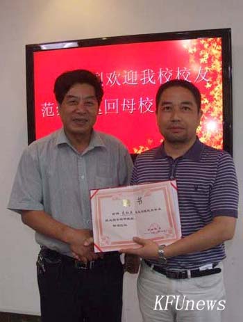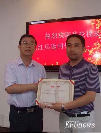 莫書記和拜校長還分別為范紅兵校友頒發了我校大學生職業指導特聘教授和開封市校友會副會長聘書。