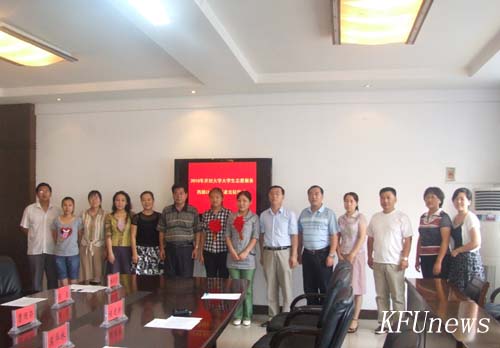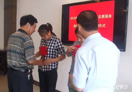 本站訊 7月25日上午,我校在行政樓二樓會議室隆重舉行2010年開封大學大學生志愿服務西部計劃錄用學生歡送會暨西部計劃志愿者出征儀式。校黨委書記莫華林、校長拜五四、副書記、副校長儲建新,黨委委員、黨政辦主任成芳、宣傳部長曹國榮、學工部部長陳巖、就業中心主任張濤、人文學院院長趙瑾,以及相關人員出席了本次歡送會。歡送會由團委樊書記主持。