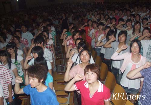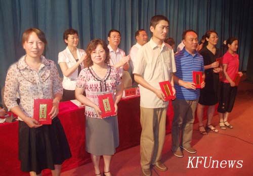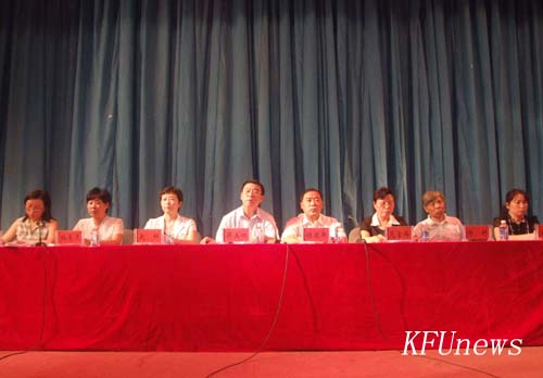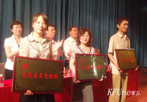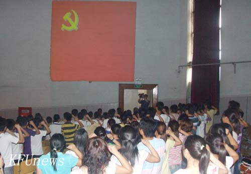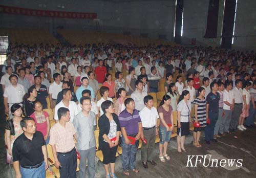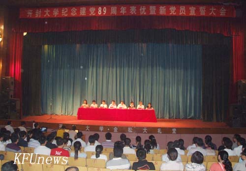 本站訊 6月25日下午,開封大學慶祝建黨89周年表優暨新黨員宣誓大會在金松大禮堂隆重舉行。校領導拜五四、儲建新、趙輝、范金梅、杜愛靈、楊樹,黨委委員、黨政辦主任成芳在主席臺就座,各黨總支、直屬黨支部教工黨員代表、新發展黨員代表和部分入黨積極分子近900人參加了會議。會議由校黨委組織部部長秦雪峰主持。