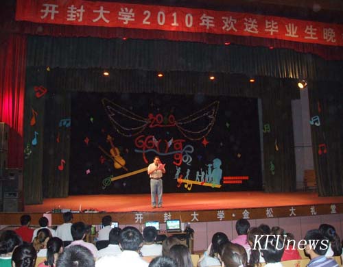 儲書記在晚會上致詞,他首先代表學校黨政,向2010屆畢業生順利完成學業表示最熱烈的祝賀,對他們為開封大學的發展所盡的努力表示最誠摯的感謝。并在講話中對畢業生提出三點希望:第一希望同學們堅守心中的理想,樹立鴻鵠之志,勇于創新,勇于探索,勇于直面挫折;敢于突破,敢擔風險,做一名敢為天下人先的人;第二希望同學們做一個有智慧、有成就的人。珍惜個人榮譽及母校聲譽,為人正派、熱愛生活,做一個道德高尚、有尊嚴的人;第三希望同學們以博愛之心親和萬物,以服務社會和天下為己任,爭做國民表率、行業精英和社會棟梁。做一個樂于奉獻、敢于承擔責任的人。最后他祝愿畢業生們前程似錦,生活幸福。