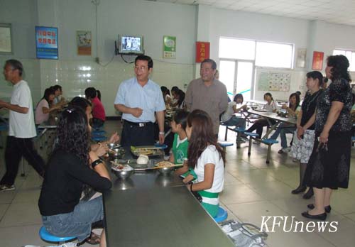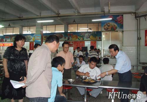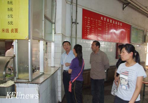 本站訊 6月10日下午,校領導拜五四、儲建新深入學生食堂,察看學生食堂飲食安全工作,黨委委員、黨政辦主任成芳、紀委副書記趙海勝、后勤服務中心黨總支書記葛華及相關人員陪同察看。校長拜五四向后勤服務中心工作人員詢問了學生食堂飯菜制作流程及飲食衛生保障措施。每到一處,他還向就餐的學生詳細了解飯菜口味、價格和工作人員服務情況等。察看結束后,拜校長強調,學生飲食安全無小事,要以對學生高度負責的態度,嚴格落實各項規章制度,強化措施,加強檢查和監督,確保學生飲食安全。