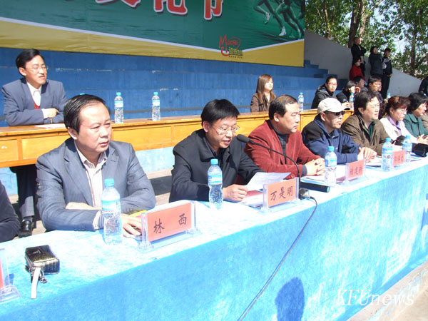 《中國體育報》資深記者、中國大眾體育紀錄評定委員會秘書長郭博文,《武魂》雜志社總編輯馮黎,中國移動通信公司河南有限公司開封分公副總經(jīng)理司林西,校領(lǐng)導儲建新、萬是明、范金梅、何世玲、杜愛靈、楊樹,以及學校各部門負責人在觀禮臺上就座。開幕式由學工部部長陳巖主持。