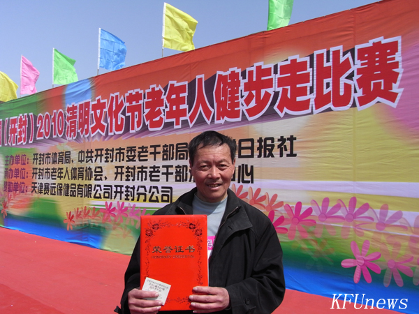 本站訊 4月2日上午,陽光明媚、春意盎然,由開封市體育局、開封市委老干部局、開封日報社聯(lián)合舉辦的2010年開封市老年人健步走比賽在美麗的龍亭湖畔拉開帷幕,我校部分老干部代表參加了比賽。比賽中,他們個個青春煥發(fā)、精神抖擻,本著“安全第一,健康第一,友誼第一”的精神走完了全程。最后,我校退休教師張德義取得了男子組第七名的好成績。