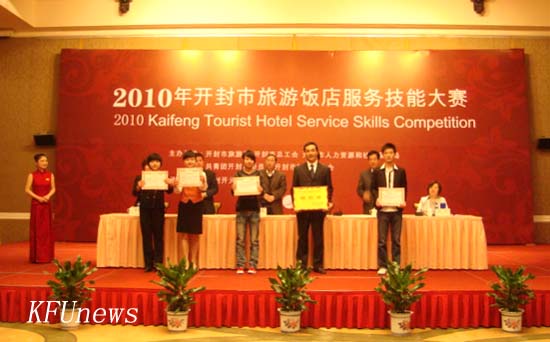 本站訊 4月22日,由開封市旅游局、開封市總工會、開封市人力資源和社會保障局、共青團開封市委員會、開封市婦女聯合會共同舉辦的2010年度開封市旅游飯店服務技能大賽在開元名都大酒店順利舉行。管理科學學院王振鵬等6名教師應舉辦單位邀請,分別作為本次技能大賽五個項目的裁判。由于本次大賽的參賽對象主要是三星級以上酒店,經過學院領導與舉辦單位的溝通協調,我院作為特邀隊參加本次大賽。學校和學院領導高度重視本次大賽,要求參加本次大賽的老師與學生嚴格刻苦訓練,并多次到訓練現場進行檢查和指導。我院組織12名旅游管理專業、酒店管理專業在校學生由陳力書記帶隊參加本次大賽的全部比賽項目,同時組織08級學生到比賽現場進行觀摩。經過一天的激烈比賽,在17家星級酒店眾多選手參賽的激烈競爭中,我院參賽隊有五名選手進入單項前六名,獲得五個單項獎和一個集體獎的優異成績。