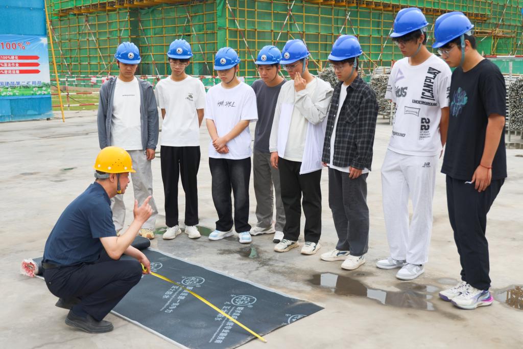 5月13日上午,王開嶺老師帶領 20 名學生,走進中建二局開封大學產教融合大樓工地。活動現場,王開嶺老師結合實際案例,向企業技術人員和工人系統講解了 “預鋪反粘” 防水技術的原理。本次培訓圍繞施工關鍵技術與質量控制要點展開系統教學,助力施工人員快速掌握該技術的核心。