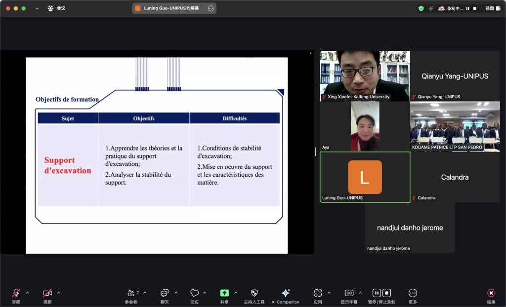 在為期三天的培訓中,500余名師生及科特迪瓦當地青年通過線上平臺參與學習交流。圣佩德羅職業技術學院的校長 Florent MORIE、培訓支持主任 Patrice KOUAME及建筑工程培訓教師 Alfred Obha BITTY 親臨現場,積極組織并參與培訓。土木建筑工程學院教研室主任邢曉飛擔任培訓講師,他憑借深入淺出的講解,贏得學員的廣泛好評。
