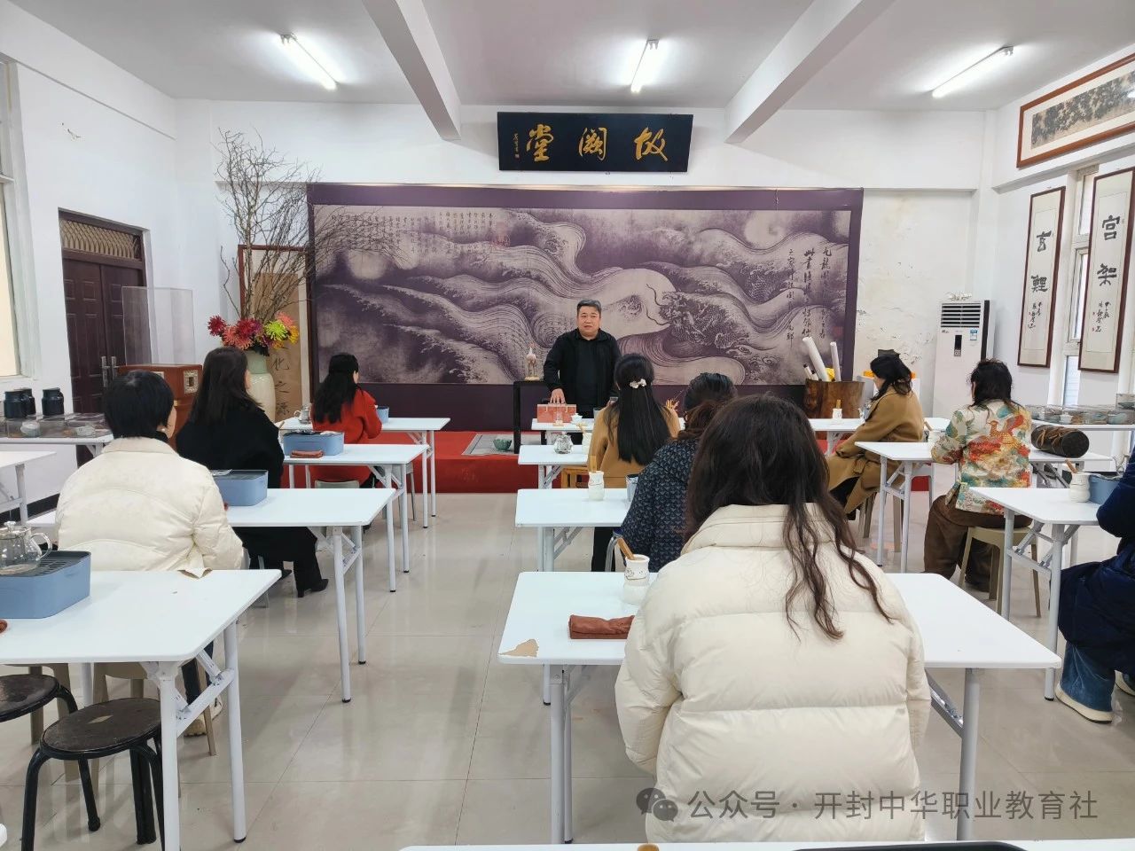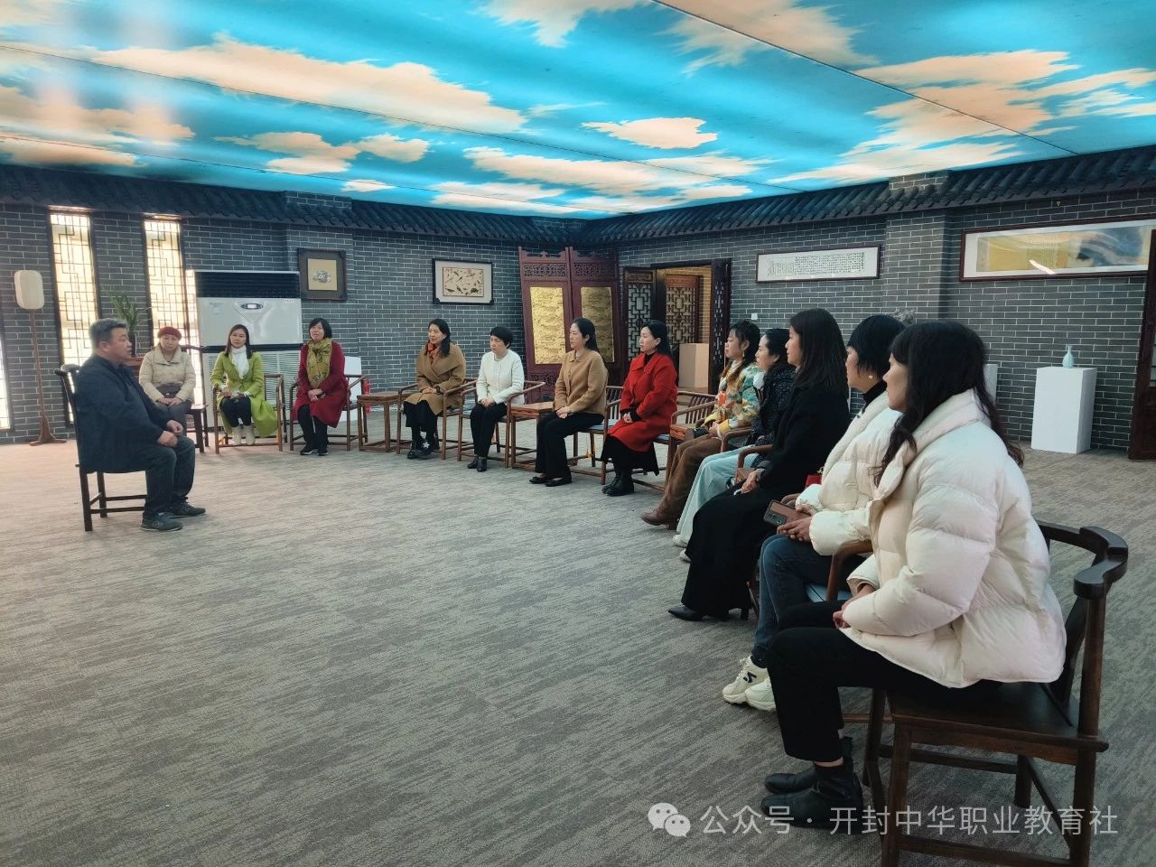 活動伊始,趙瑾帶領女社員們參觀了開封大學文化與旅游學院的宋文化實訓基地。古色古香的建筑,精致典雅的陳設,仿佛將大家帶回了千年前的宋朝。王東詳細講解了宋代點茶、緙絲等文化,以及茶文化在宋代文人雅士生活中的重要地位,讓大家對宋文化有了更直觀的感受。