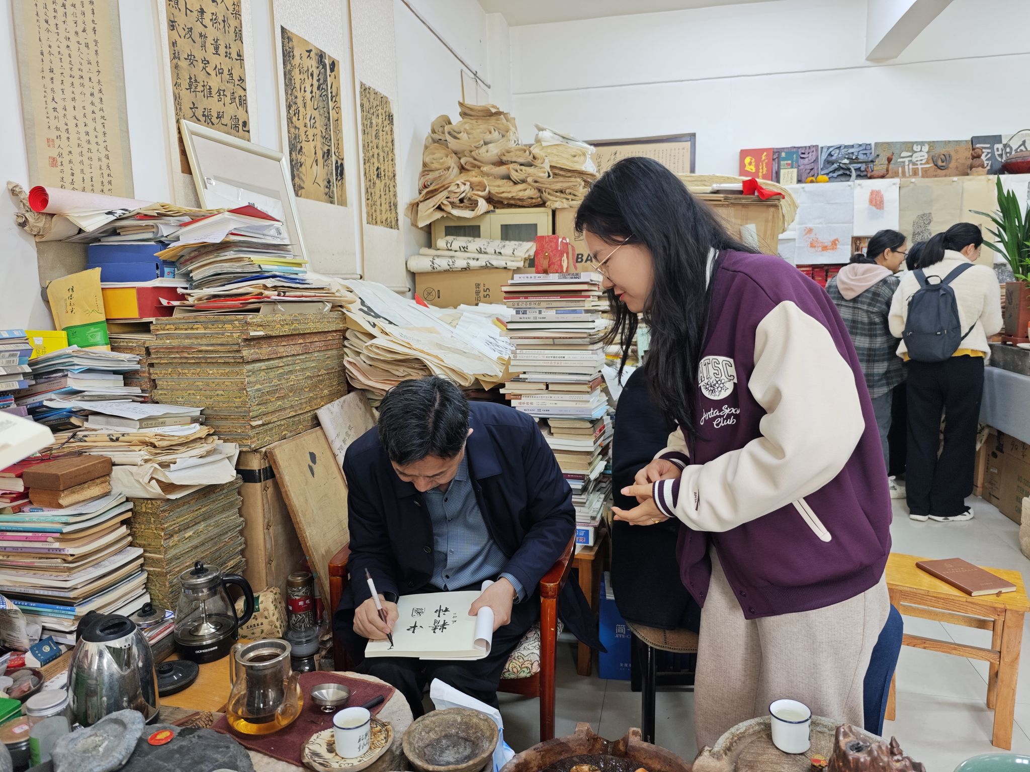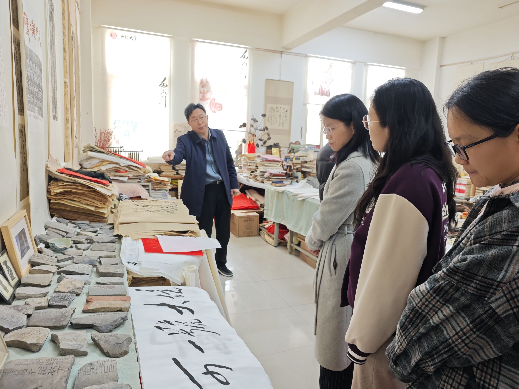 隨后,大家來到毛成利書法創新工作室。毛成利老師是開封大學書法專業的資深教授,在書法創作和理論研究方面造詣頗深。他熱情地向大家介紹了工作室的建設情況、教學理念以及近年來取得的成果,并現場揮毫潑墨,展示了精湛的書法技藝。一幅幅筆力遒勁、氣韻生動的書法作品,令在場人員嘆為觀止,深刻感受到中華書法藝術的博大精深。