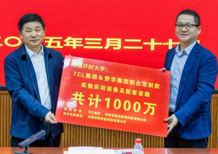 雙方共同簽署了校企合作協議,TCL集團和開封市贊宋教育科技有限公司共同向開封大學捐贈實驗實訓設備及配套設施,并為優秀學生頒發獎學金。