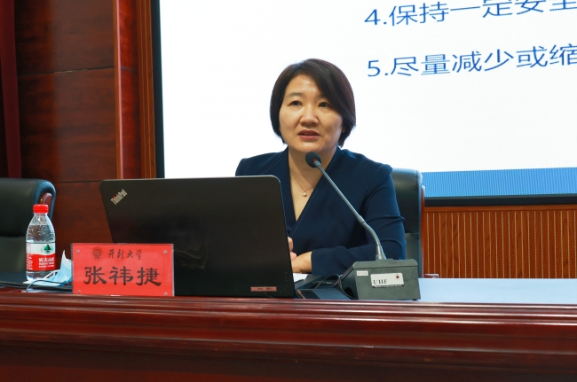 報告中,張祎捷教授從傳染病基本知識、呼吸道傳染病種類及特點、呼吸道傳染病的校園防控和踐行健康中國行動四個方面進行了重點介紹,并現場演示了世界衛生組織推薦的“七步洗手法”,極大提高了大家的健康安全意識。她建議,在呼吸道傳染病流行期間,師生要減少聚集、正確佩戴口罩、勤洗手、開窗通風、堅持鍛煉、平衡營養,做到科學防護,避免傳染病的侵襲。