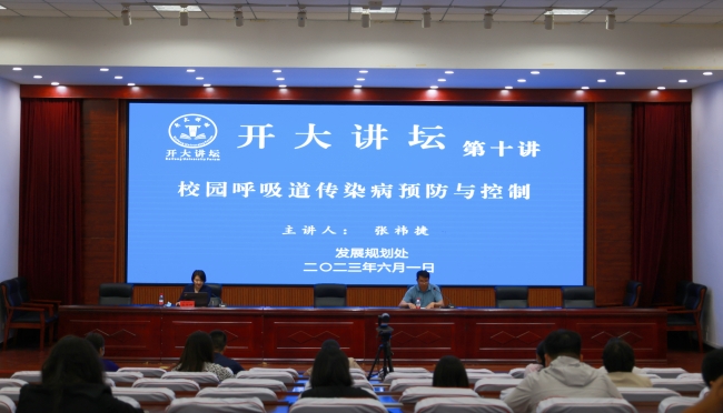 本站訊 6月1日下午,“開大講壇”系列報告第十講在行政樓第一會議廳舉行。河南大學淮河醫院院長、主任醫師、二級教授、碩士研究生導師張祎捷,應邀作了“校園呼吸道傳染病預防與控制”的主題報告。副校長萬是明出席報告會,各單位、各部門負責人,院部師生通過線上線下聆聽了報告。報告由發展規劃處處長葉飛主持。