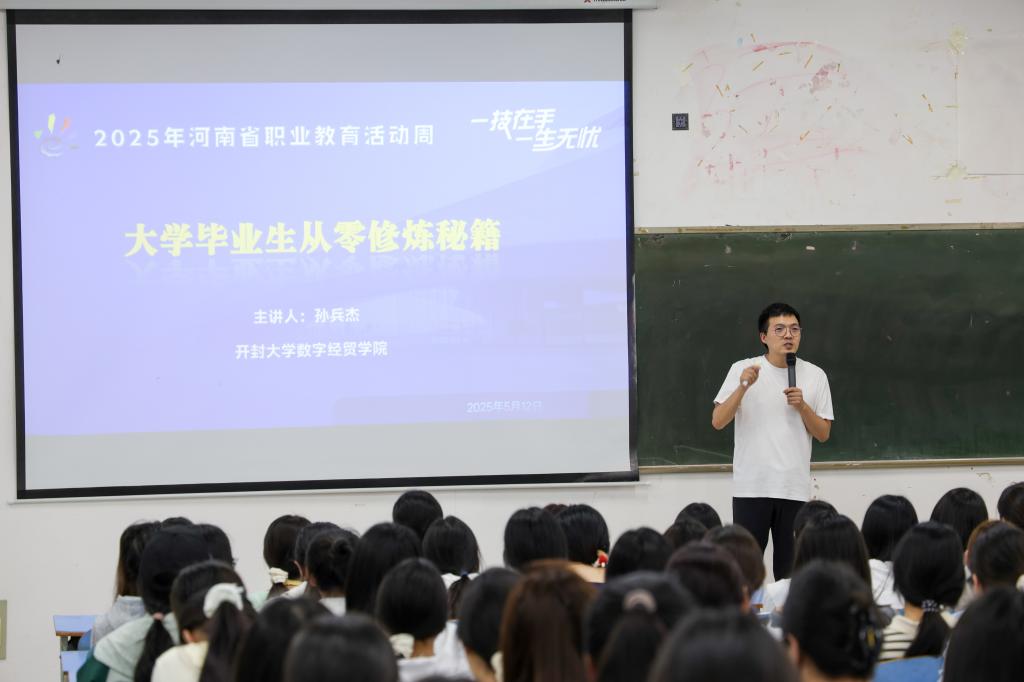 本站訊 為落實《河南省教育廳辦公室關于做好2025年河南省職業教育活動周相關工作的通知》文件要求,5月12日下午,數字經貿學院開展“技能人才風采日——與青年學子共話匠心”優秀校友講座活動,特邀河南起業云科技發展有限公司董事長、開封市第十三屆政協委員、開封青年五四獎章獲得者、河南省青年崗位能手、2012屆市場營銷專業畢業生孫兵杰,為學生做了一場題為《大學畢業生從零修煉秘籍》的精彩講座。院長尤影、學院師生代表參加本次活動。