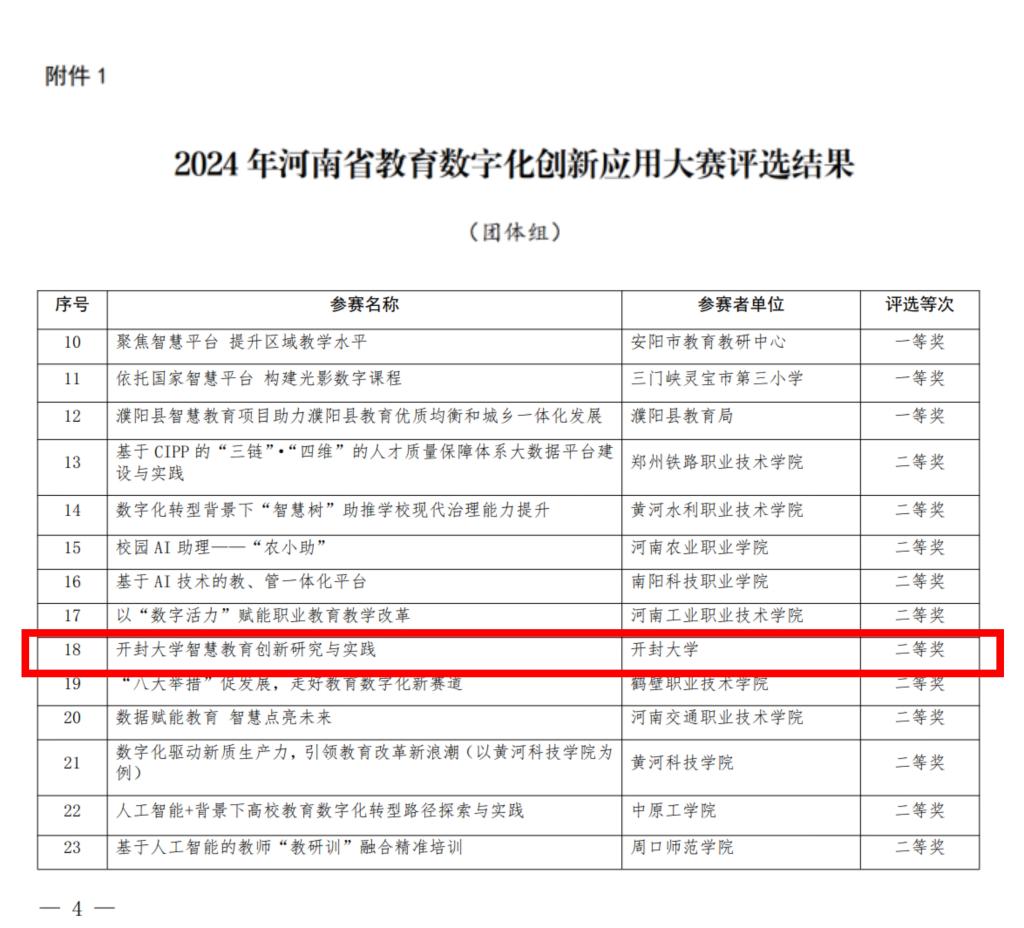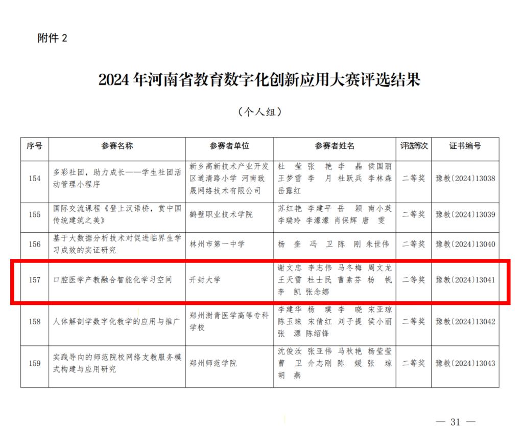 本站訊 近日,我校在2024年河南省教育數(shù)字化創(chuàng)新應用大賽中兩項作品獲獎,其中信息化管理中心報送的作品《開封大學智慧教育創(chuàng)新研究與實踐》榮獲團體組二等獎,謝文忠、李志偉、馬冬梅等教師指導作品《口腔醫(yī)學產(chǎn)教融合智能化學習空間》榮獲個人組二等獎。