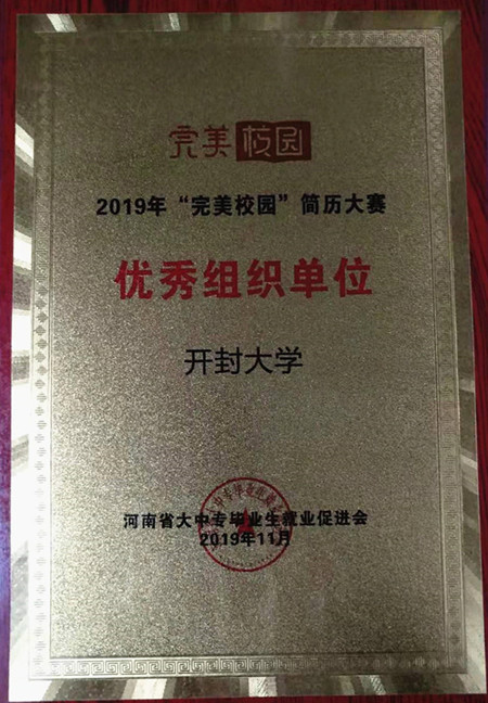 近日,在河南省大學生就業(yè)創(chuàng)業(yè)綜合服務基地舉行河南省2019“完美校園”簡歷大賽頒獎典禮,我校獲得優(yōu)秀組織單位獎榮譽稱號。
