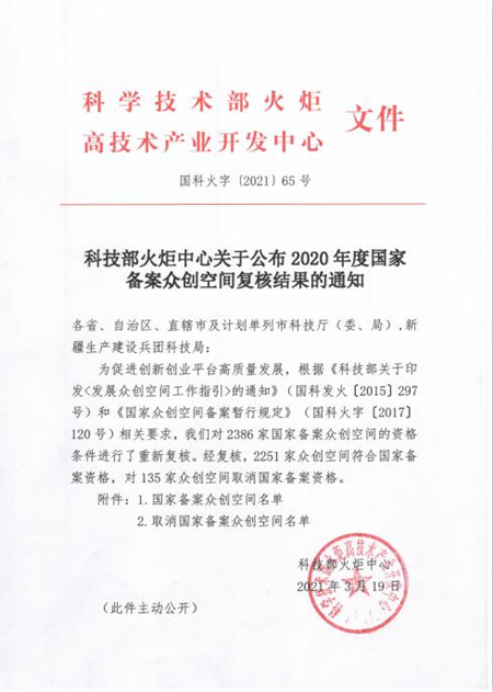 近日,科技部火炬中心發布了《關于公布2020年度國家備案眾創空間復核結果的通知》(國科火字〔2021〕65號),我?!伴_封大學眾創空間”順利通過科技部火炬中心2020年度國家備案眾創空間復核,繼續保留國家備案資格。