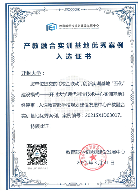 活動開展以來,我校高度重視、強化管理、狠抓落實,積極開展申報。最終,我校《校企聯(lián)動,創(chuàng)新實訓(xùn)基地“五化”建設(shè)模式——開封大學(xué)現(xiàn)代制造技術(shù)中心實訓(xùn)基地》案例從全國眾多案例中脫穎而出,成功入選教育部產(chǎn)教融合實訓(xùn)基地優(yōu)秀案例。