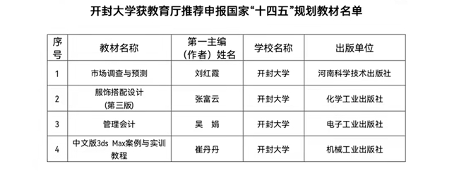 河南省“十四五”普通高等教育規劃教材立項建設工作,旨在集中優勢力量,建設一批反映我省學科優勢特色、符合我省人才培養需要,具有科學性、時代性和前沿性的高水平教材,打造河南高等教育教材品牌,提升高等教育人才培養質量和辦學水平。經個人申報、學校推薦,省教育廳組織的資格審查、網上審讀、會議評審等環節,確定入選教材。