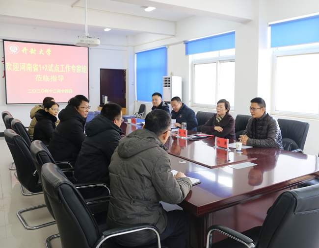 12月14日上午,根據教育部職業教育與成人教育司《關于開展1+X證書制度試點工作抽查檢測的通知》文件要求,省教育廳專家組組長、開封大學副校長趙輝,省1+X試點推進辦公室主任梅波,副主任楊濤和秦軍磊四位專家蒞臨我校,抽檢并調研學校1+X試點推進情況及存在問題。教務處處長馮天才主持會議,副處長王艷玲、谷向韶、劉奎及相關工作人員參會。
