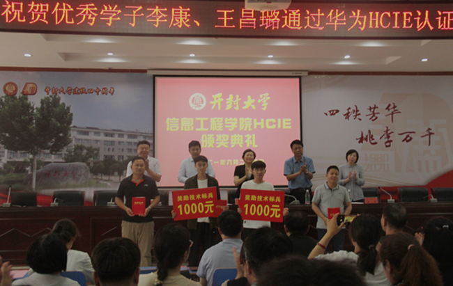 本站訊 6月24日下午,我校信息工程學院HCIE頒獎大會在土木建筑工程學院六樓報告廳舉行。華為政企業務部開封總經理楊昊,校黨委委員、副校長趙輝出席了大會,教務處處長馮天才、信息工程學院黨總支書記袁震、院長楊樺等領導和信息工程學院全體教師和各專業學生代表300余人參加了大會。大會由信息工程學院副院長李響主持。