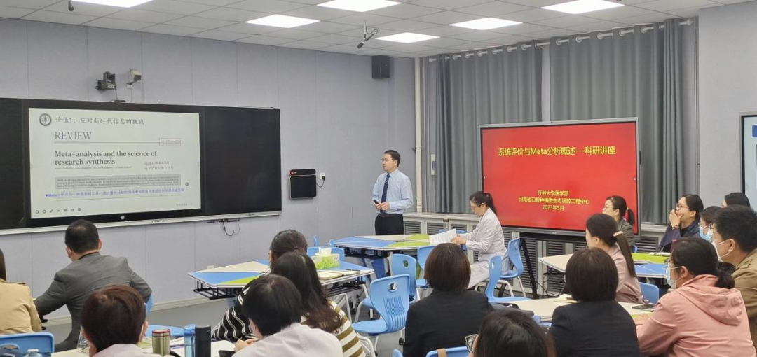 為進一步提升河南省口腔種植微生態調控工程研究中心的建設,5月6日上午,醫學部特邀國家重點研發計劃青年首席科學家、湖北省青年拔尖人才、武漢大學中南醫院循證與轉化醫學中心常務副主任、博士生導師、主任醫師曾憲濤教授到校作題為《系統評價與Meta分析概述》的科研講座。講座由口腔種植微生態調控工程研究中心學科帶頭人馬惠萍教授主持,開大黨委委員謝文忠、醫學部各教研室主任及部分工程研究中心老師聆聽講座。