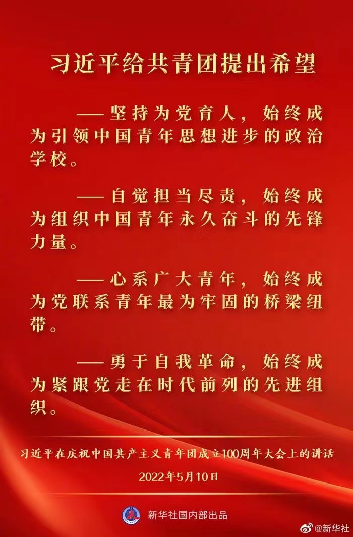 慶祝中國共產主義青年團成立100周年大會5月10日上午在北京人民大會堂隆重舉行。中共中央總書記、國家主席、中央軍委主席習近平出席大會并發表重要講話。 中共中央總書記、國家主席、中央軍委主席 習近平在慶祝中國共產主義青年團成立100周年大會上的講話.pdf